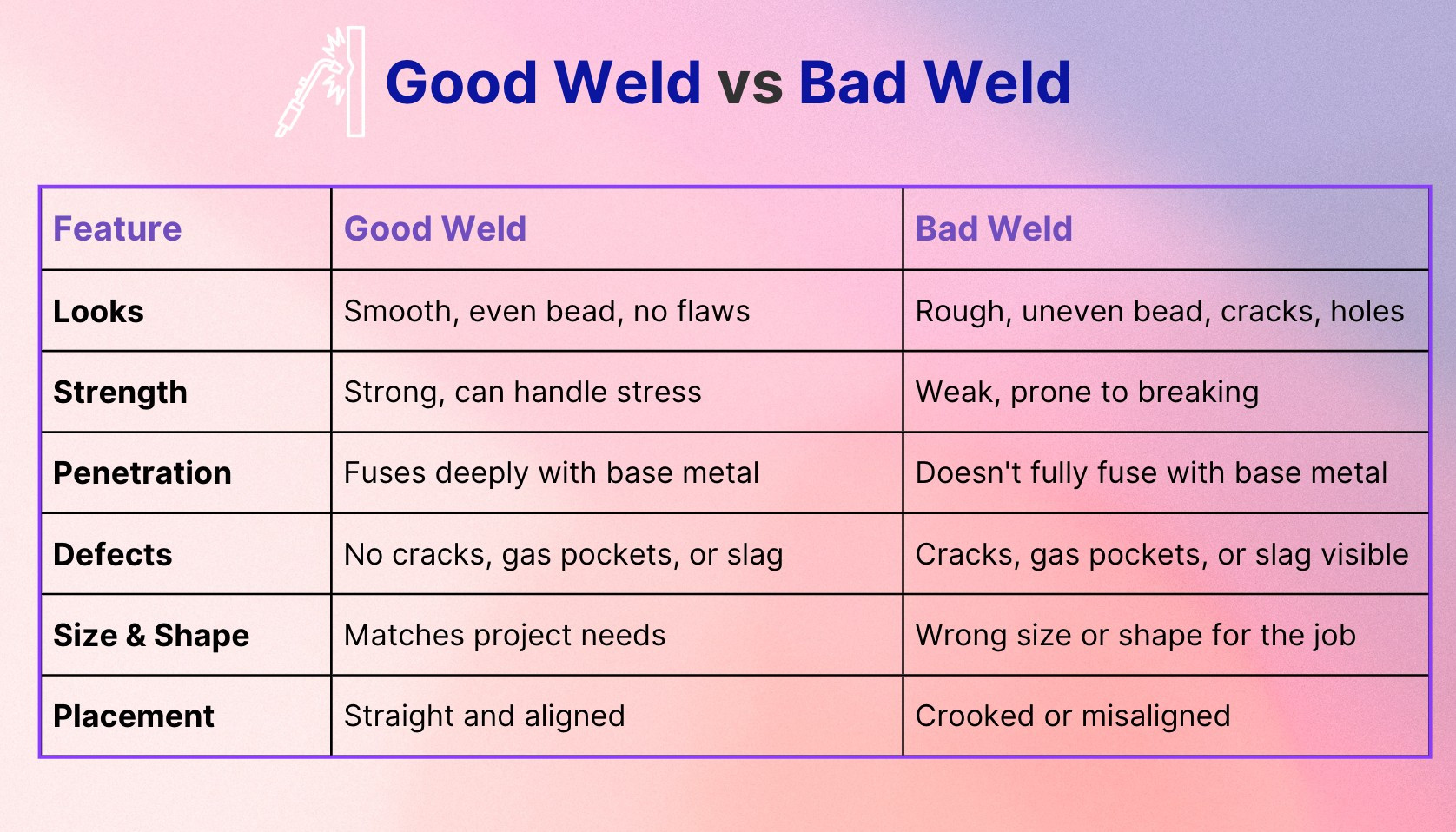 This article will examine good and bad welds. A good weld is solid and smooth, while a bad weld can be weak or ugly. We'll explore what makes a weld good or bad, which can help welders do better work and help people check if a weld is done right. Understanding welds is essential for safety and quality in metalwork. We'll learn about the signs of good and bad welds and why they matter.
