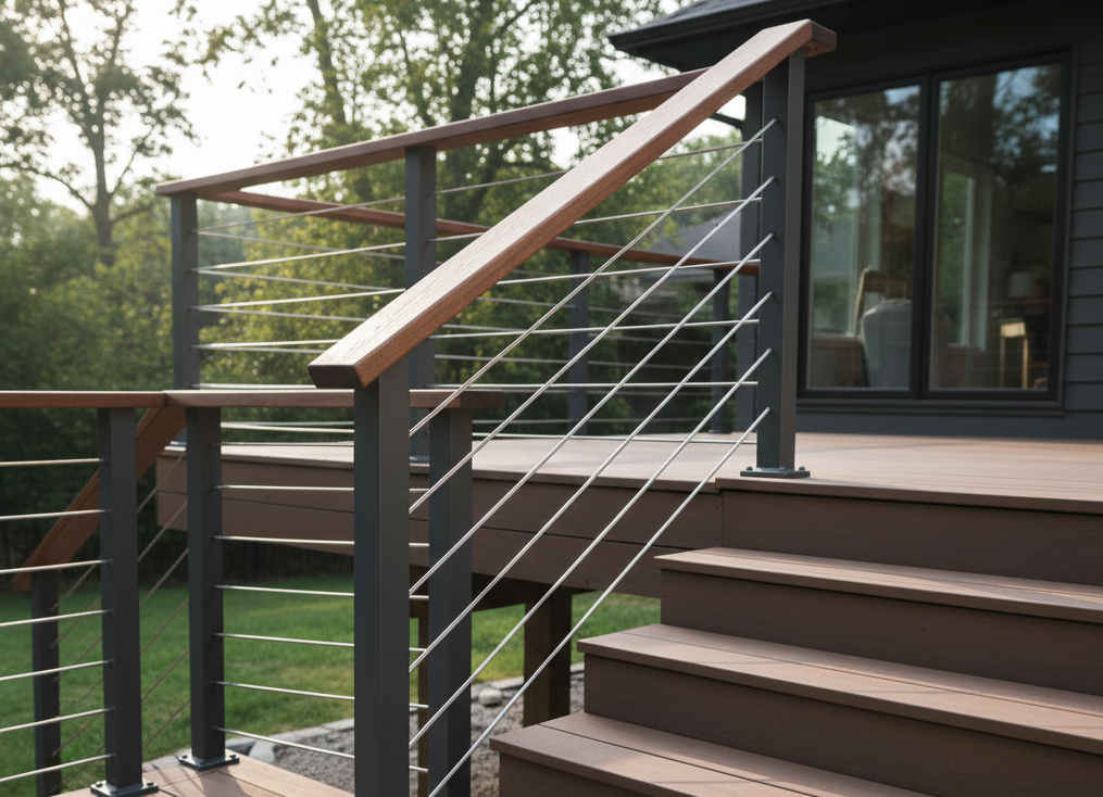 Horizontal stainless-steel cable railings are perfect for modern deck designs across homes. Thin cables stretched between posts create clean, linear patterns that feel contemporary. They maintain views while providing required safety barriers for elevated outdoor spaces. Cable railings blend beautifully with natural surroundings and landscapes.