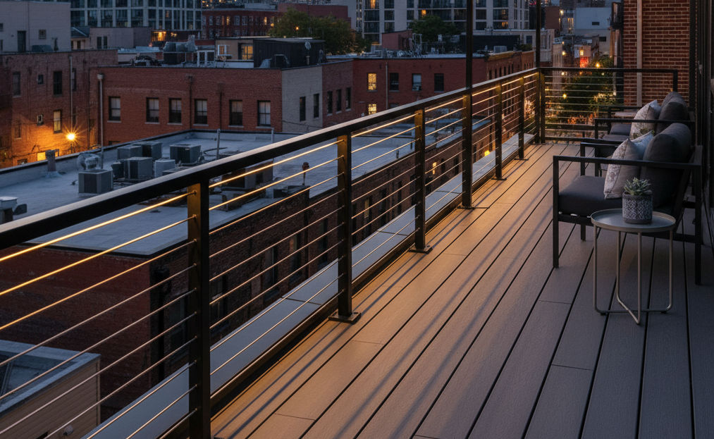 Black cable railings bring bold, industrial style to contemporary urban townhomes and condos. The dark finish creates striking contrast against lighter architectural elements and siding. Black-coated cables and posts resist fading while maintaining their dramatic appearance beautifully. They add a sophisticated edge to city living spaces.